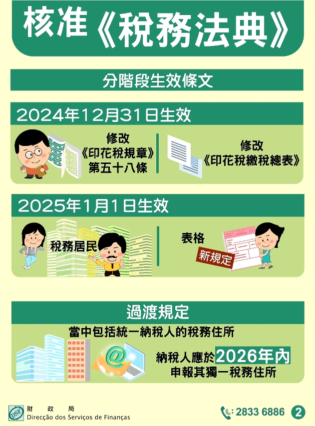 核准《稅務法典》自2026年1月1日起全面生效。相關過渡規定,包括統一納稅人的稅務住所,自2026年1月1日起計一年內,納稅人應向財政局告知或變更其獨一稅務住所。